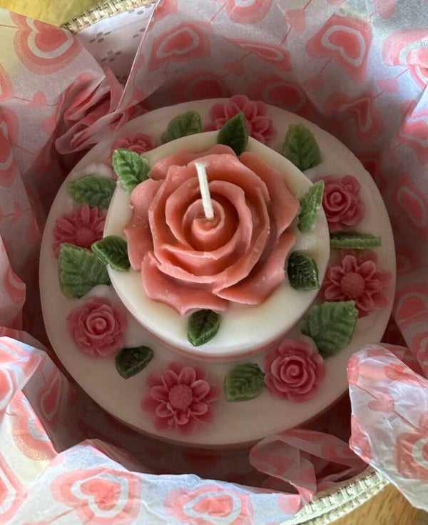 Wedding Cake Candle speciale editie. Hier is er maar 1 van. Speciaal gemaakt voor bv een bruiloft of bv een verloving. De taart is bewerkt met roosjes en de tinten zijn op elkaar afgestemd.
