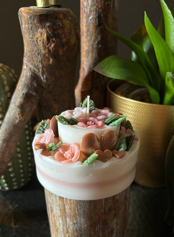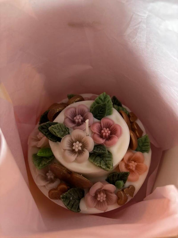 Prachtige taart van kaars in 2 lagen. Belegd met bloemen en brons kleurige hartjes.
