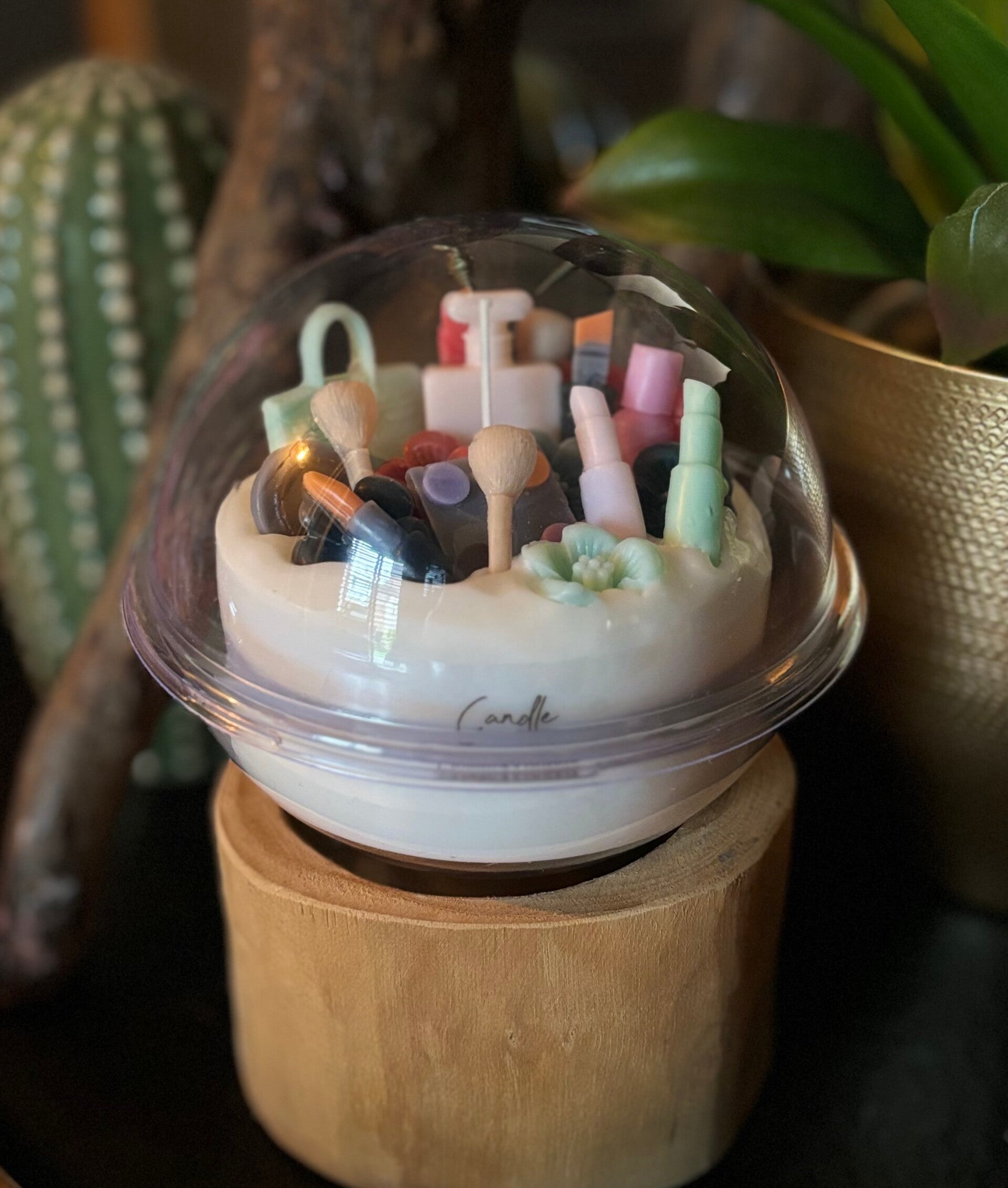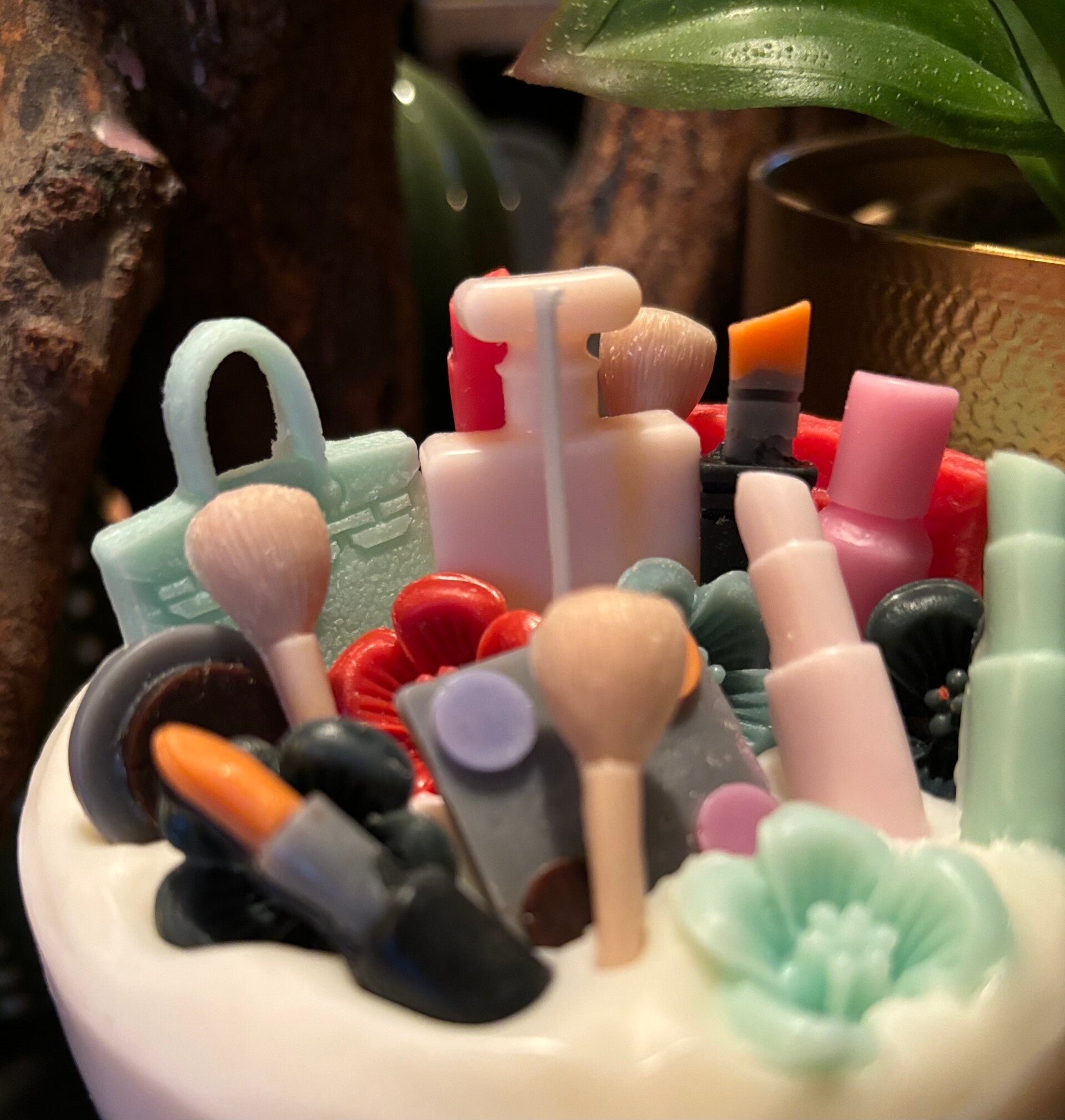 Deze taart Cake zit boordevol make up items en trendy stuff. Zoals make up pallet, poederdoos, kwasten, lippenstift, nagellak, handtas en bevat matching flowers. Leuk bijvoorbeeld voor een sweet 16 party om kado te geven. Of om als decoratie op tafel te gebruiken.