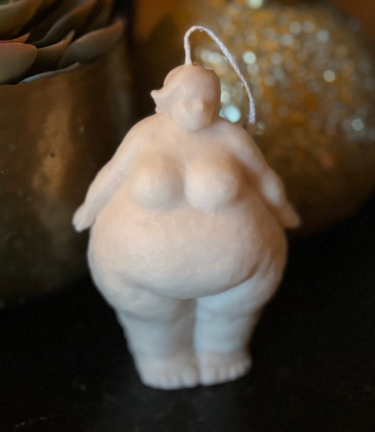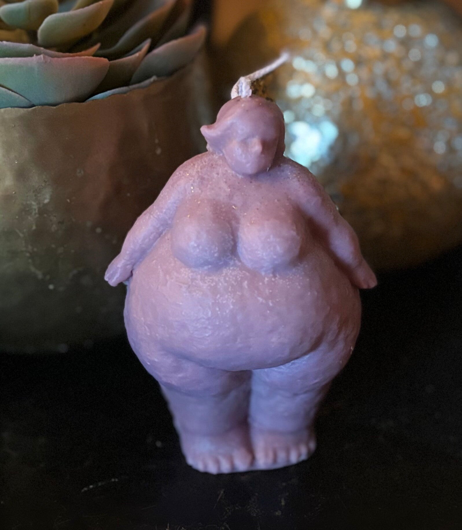 Deze mooie kaars van een vollere dame verdiend alle aandacht. De naam Dikke Dame doet dan ook eigelijk geen eer aan, maar helaas staat ze zo omschreven. Deze schoonheid is zowel staand als zittend te koop. Dit betreft de staande versie en ze komt is 3 kleuren. Aubergine, licht roze en melk.