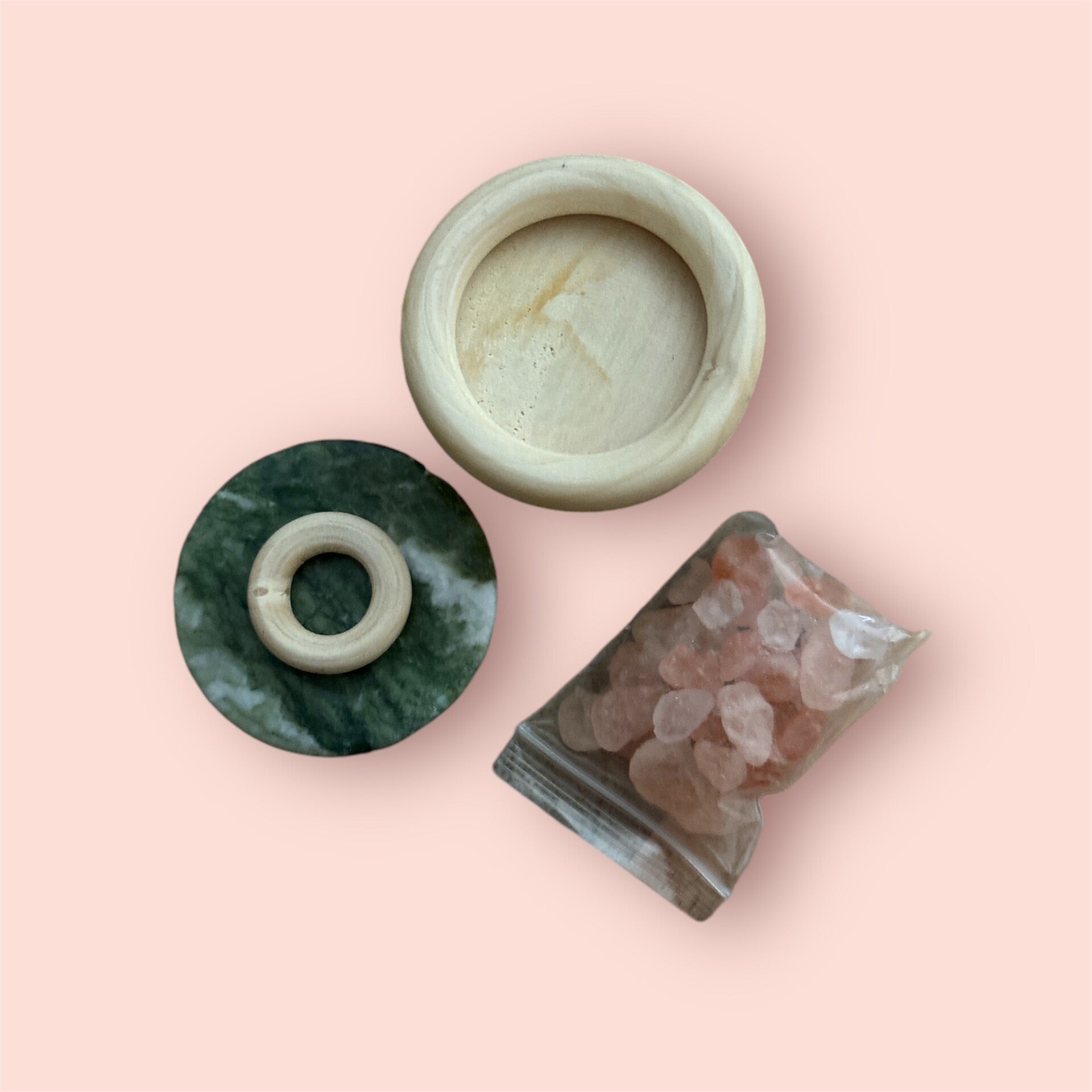 Marmer voetje, houten schaaltje met stenen naar keuze.