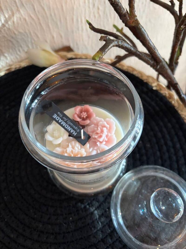 Stolp met Nude kleurige wax bloemen. Hoog smal model.