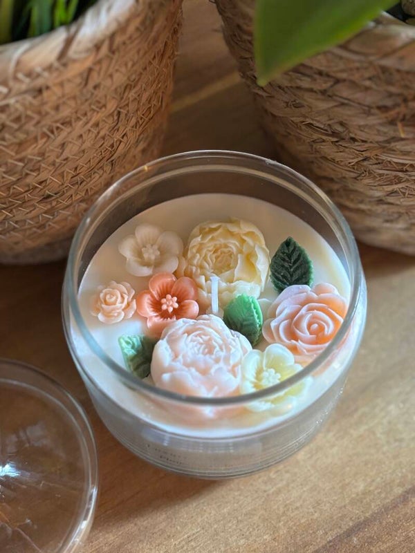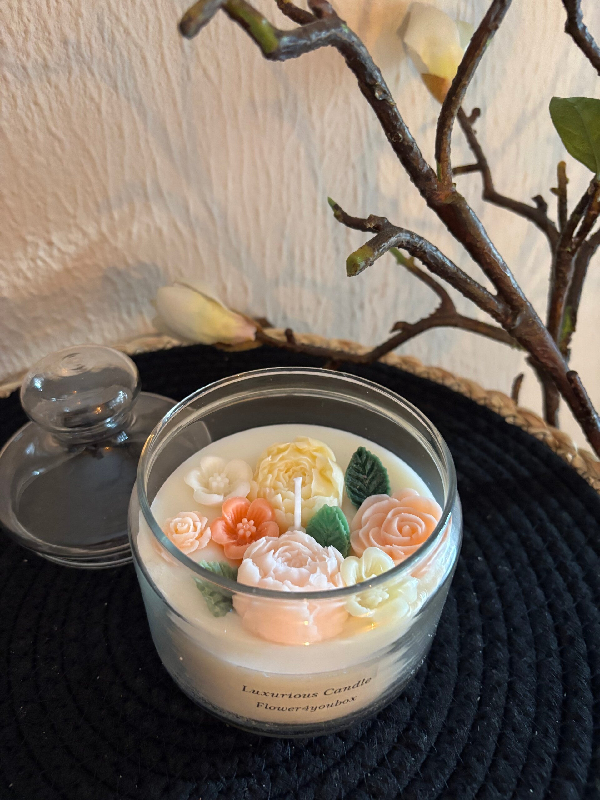 Mooie luxe kaars. Gedecoreerd in pastel tinten wax bloemen.