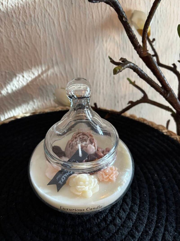 Kleine stolp met deksel gedecoreerd met natuur tint wax bloemen.