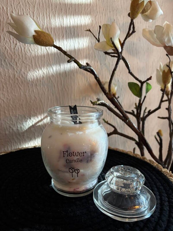Prachtige kaars gevuld met gedroogde kleine bloemetjes en rozen blaadjes. Al brandend geeft dit een mooi effect en worden de gedroogde bloemetjes goed zichtbaar..