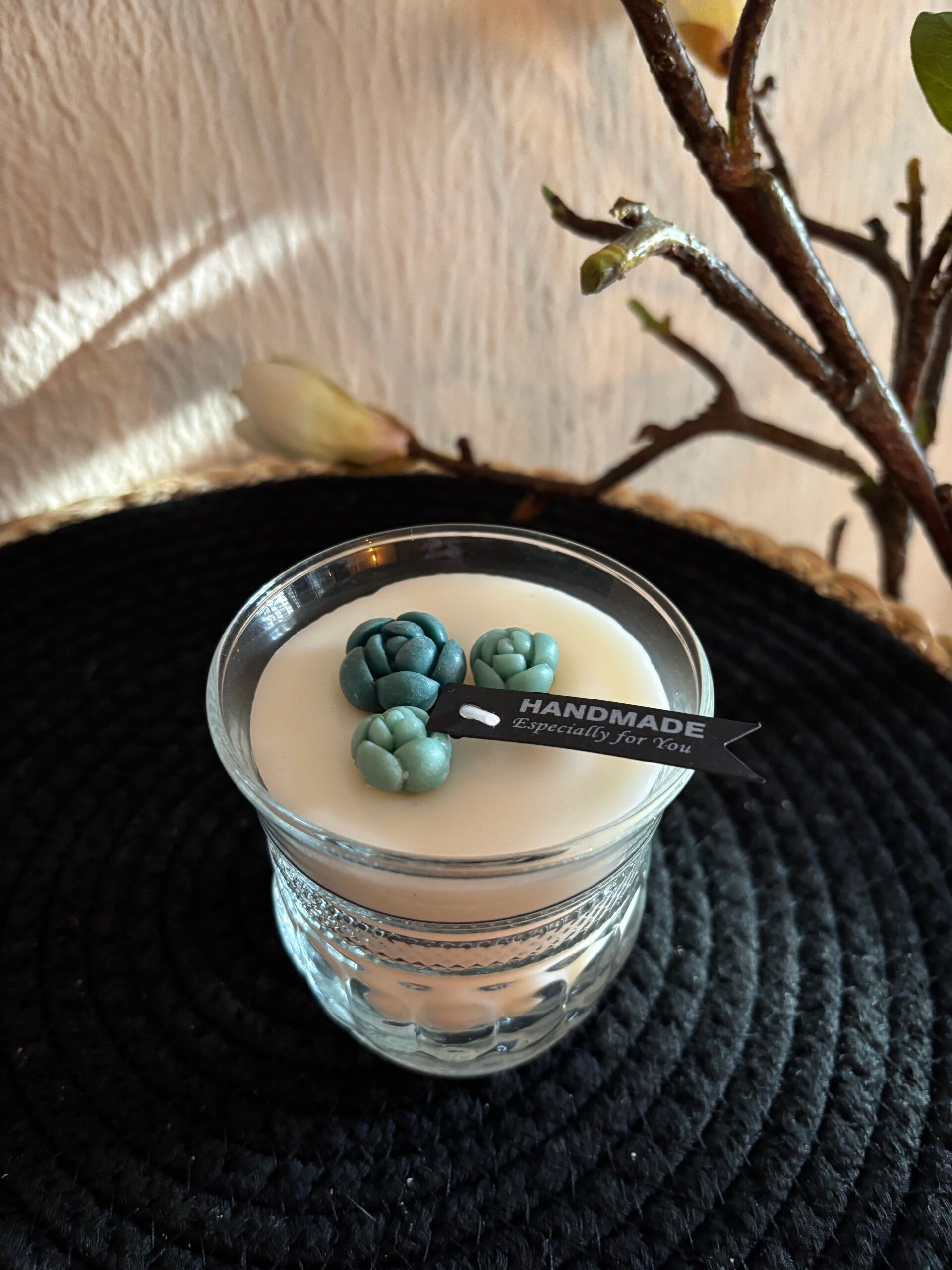 Kaars in sierlijk glas. Bovenop wax vetplantjes.