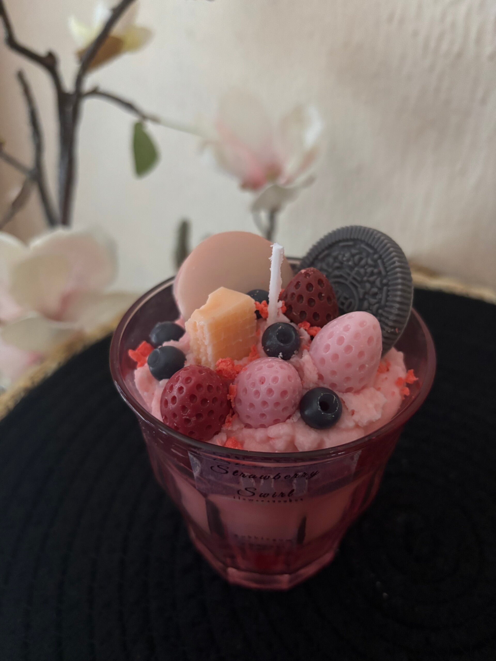 Super zoet uitziende kaars. Aardbeien coupe met een sausje. Bijna om op te eten zo leuk.