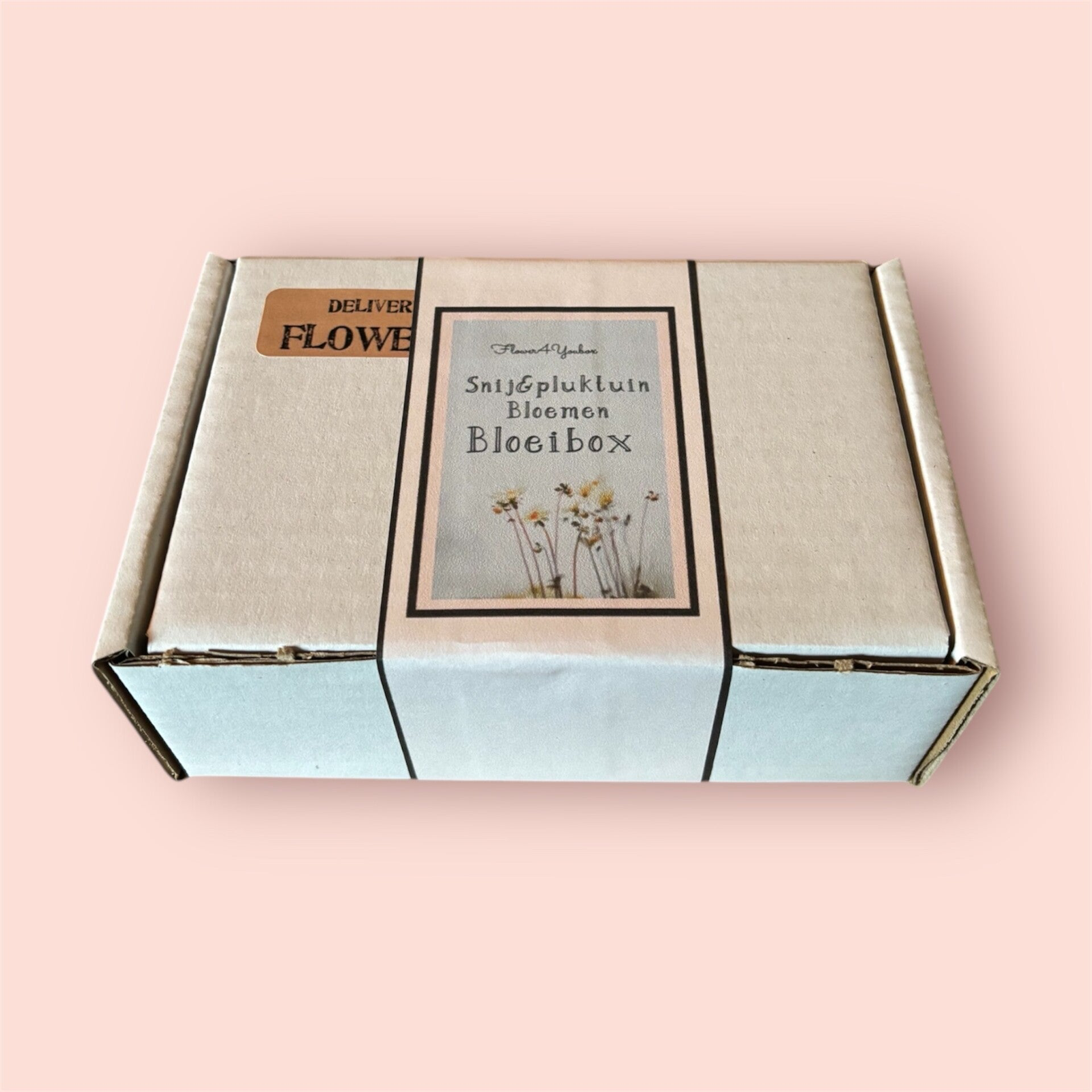 Snijbloemen en Pluktuin bloemen in een box , gevuld met de benodigdheden om ieder moment van het jaar je eigen boeketje te laten groeien.