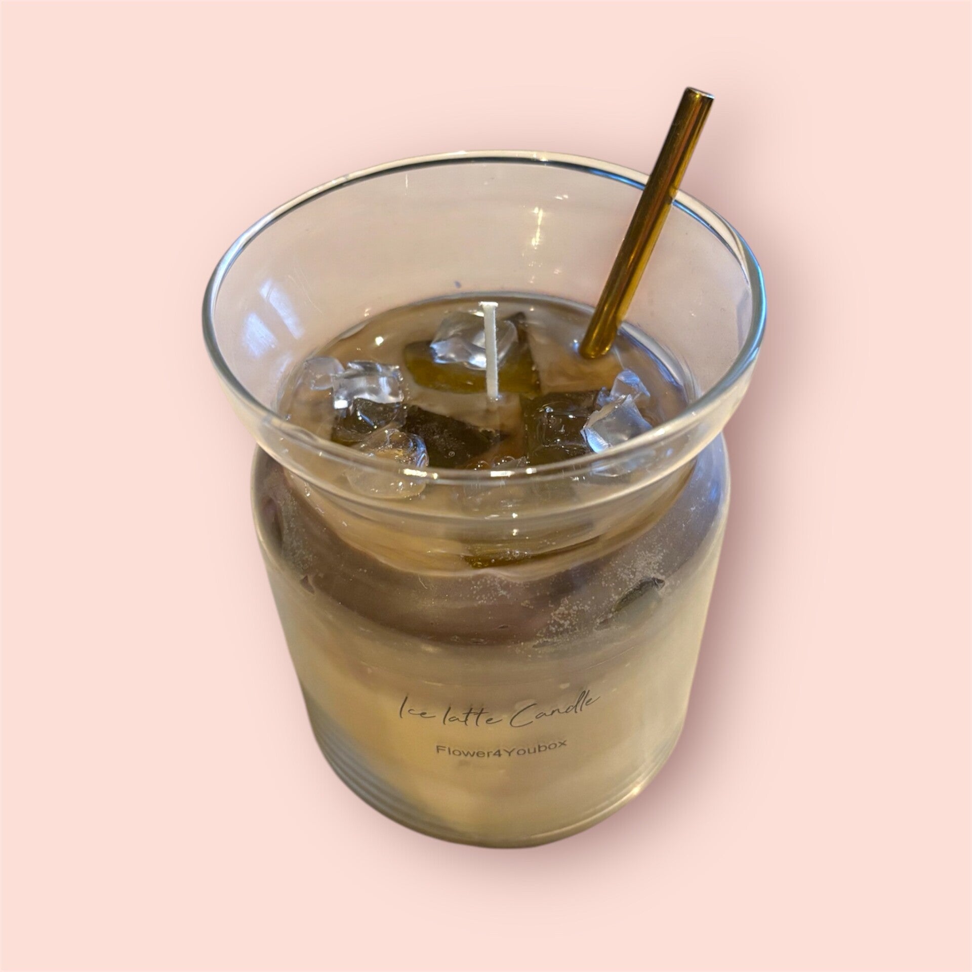 Mooie grote café latte kaars. Mat heerlijke geur. Gevuld met doorzichtig kaars wax als ijsblokjes.