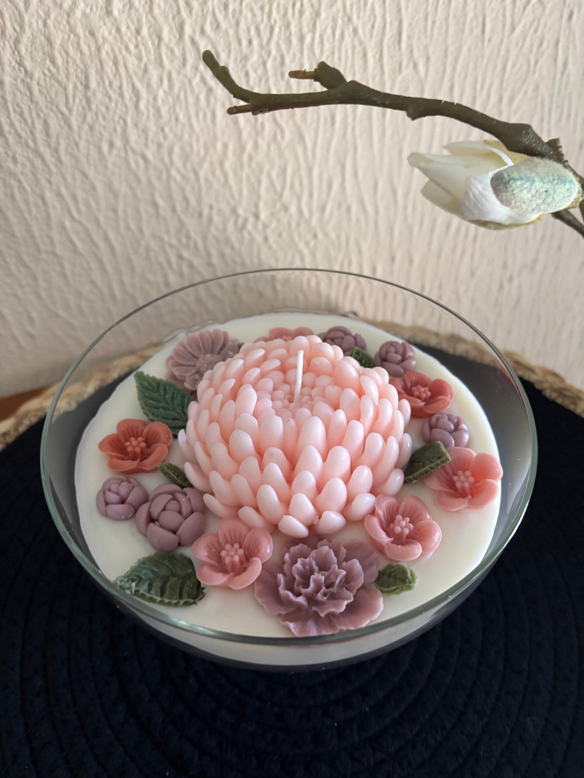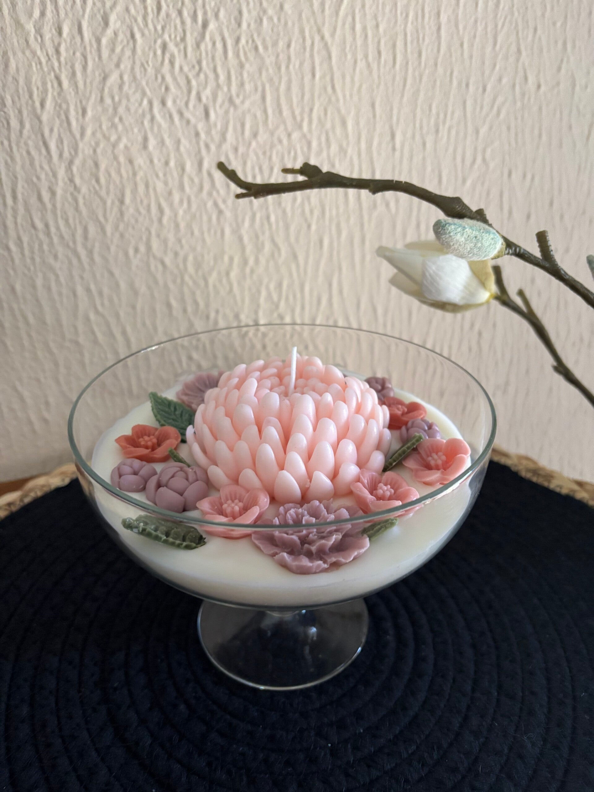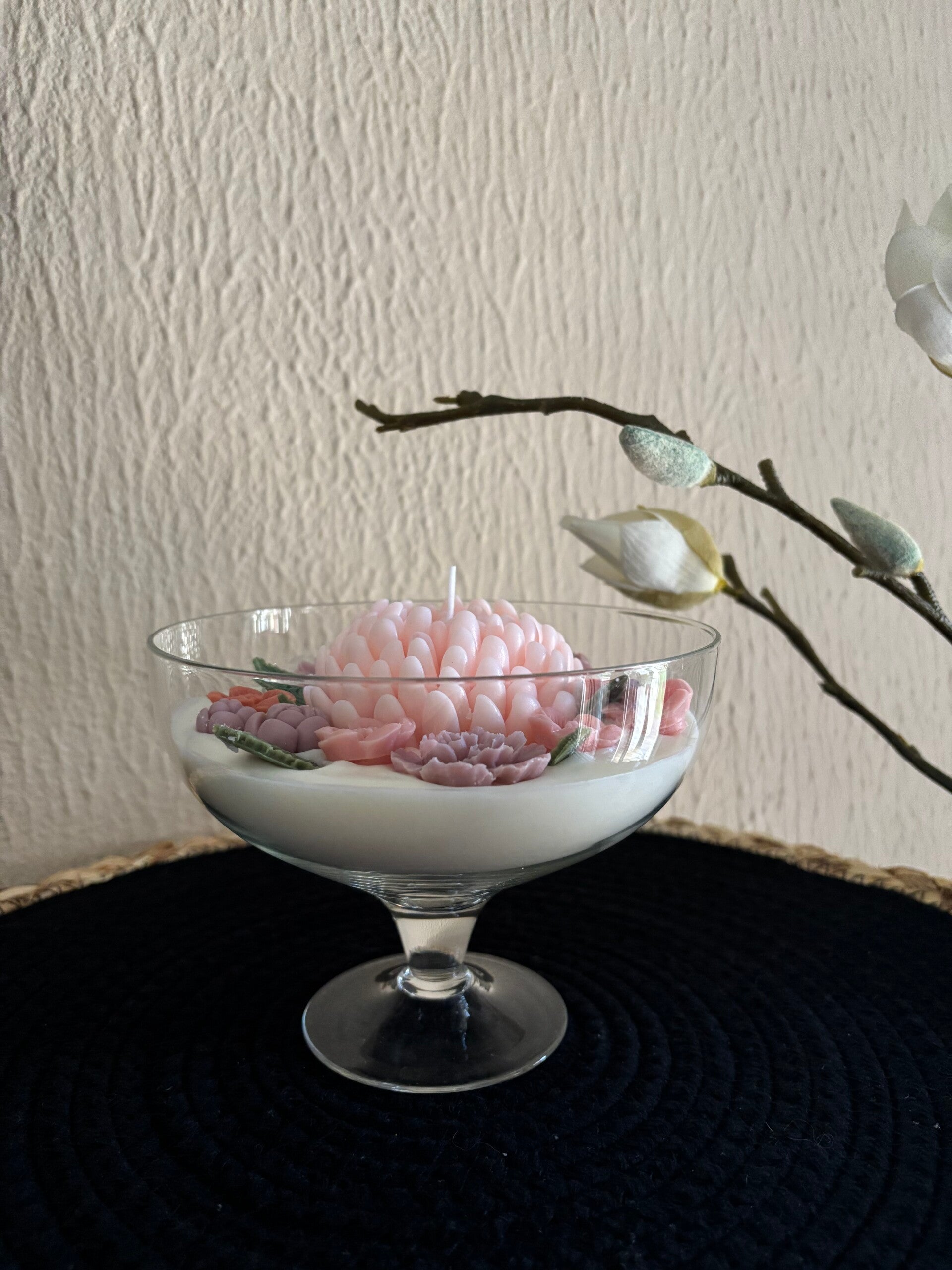 Mooie zachte roze tinten. Een glazen schaal op voet. Gevuld met kaars wax en soya wax bloemen. De kaars heeft een heerlijke roos geur.