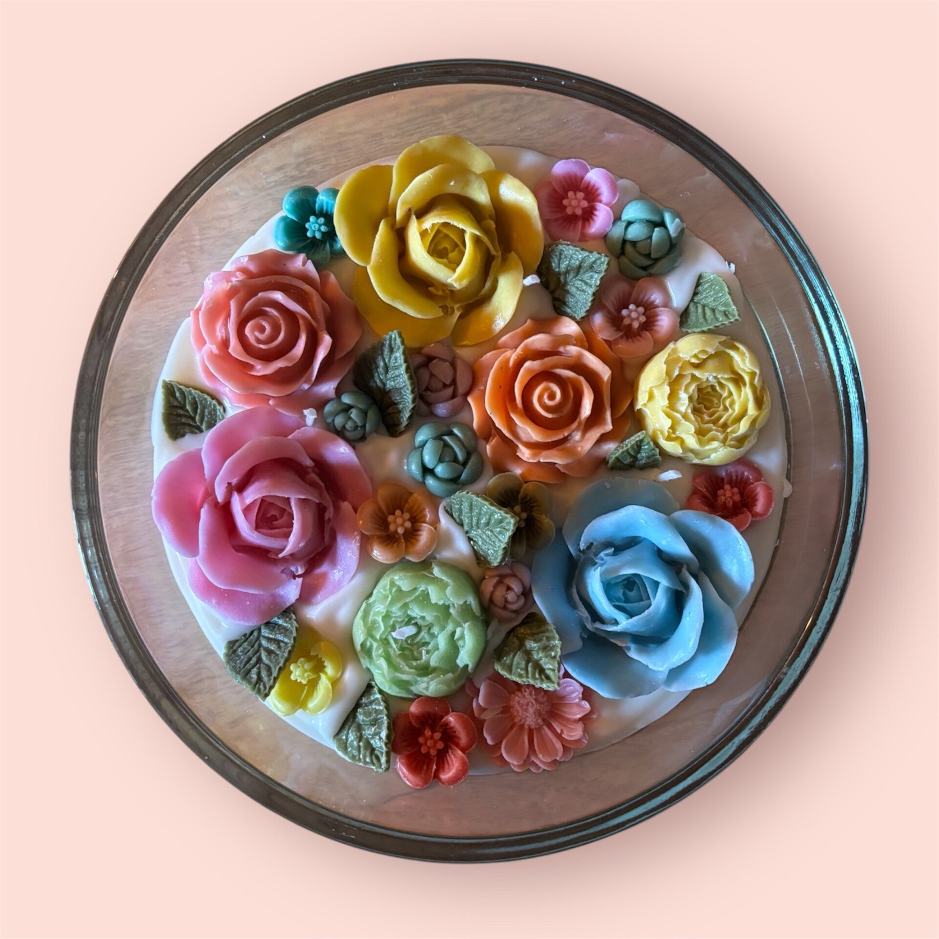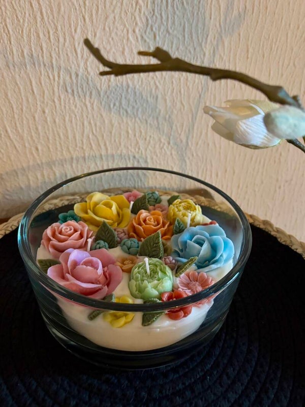 prachtig mooie glazen schaal met vrolijke spring flowers kaars. In de geur Roos. De wax bloemen zijn zorg vuldig gemaakt en uitgezocht als een prachtig bloemen arangement.