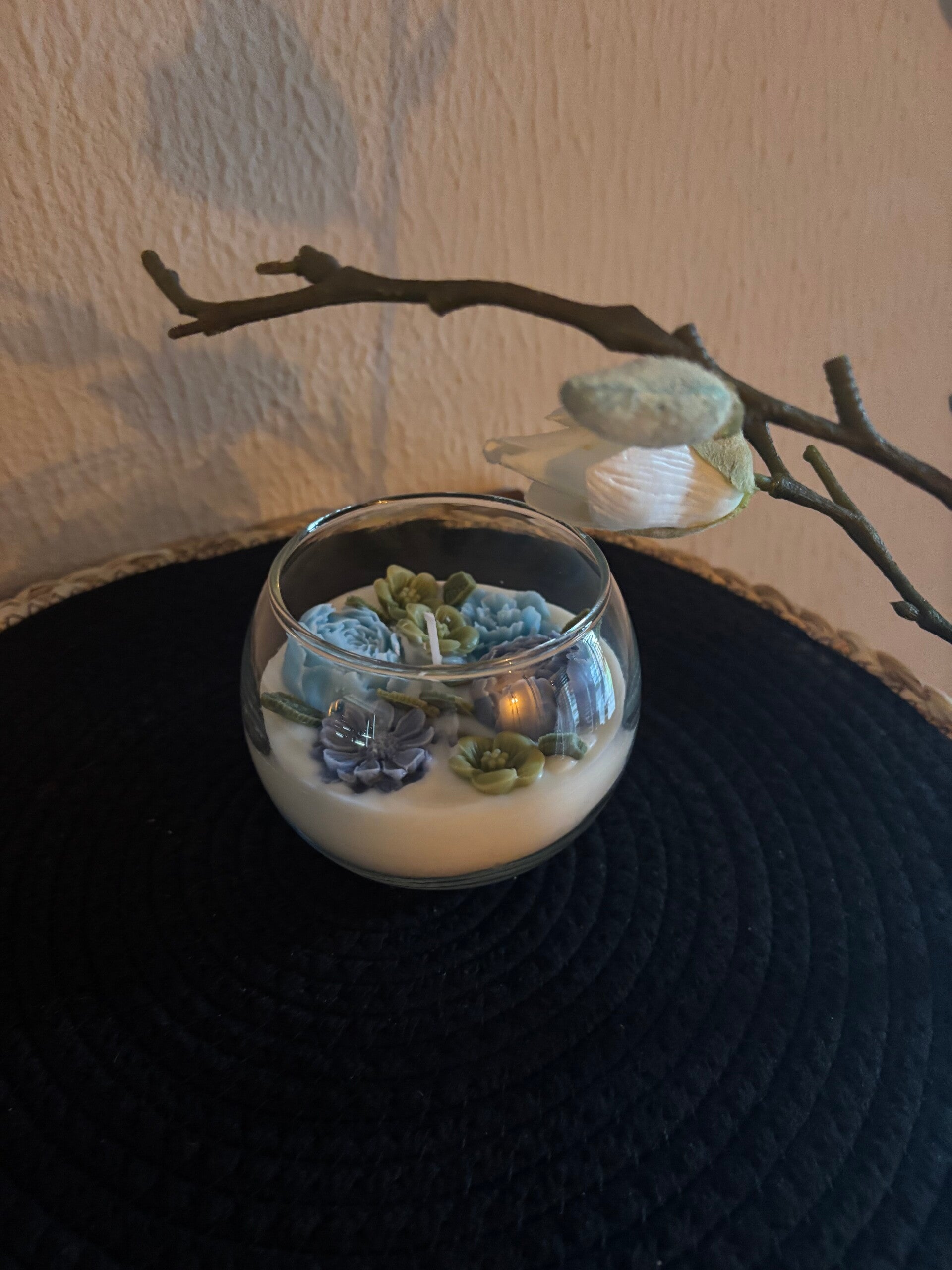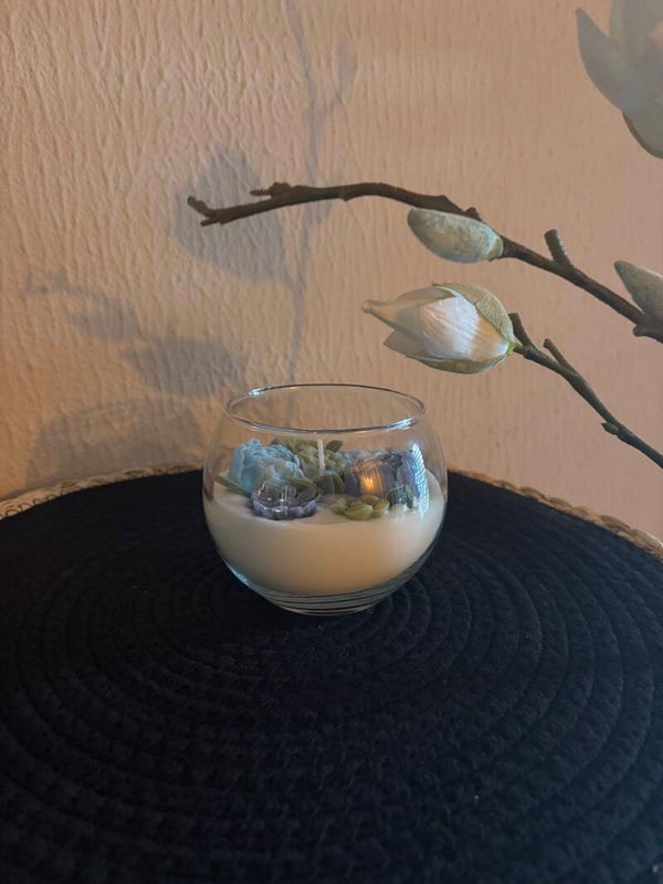Mooie glazen bol gevuld met kaars en wax bloemen in een blauw thema.