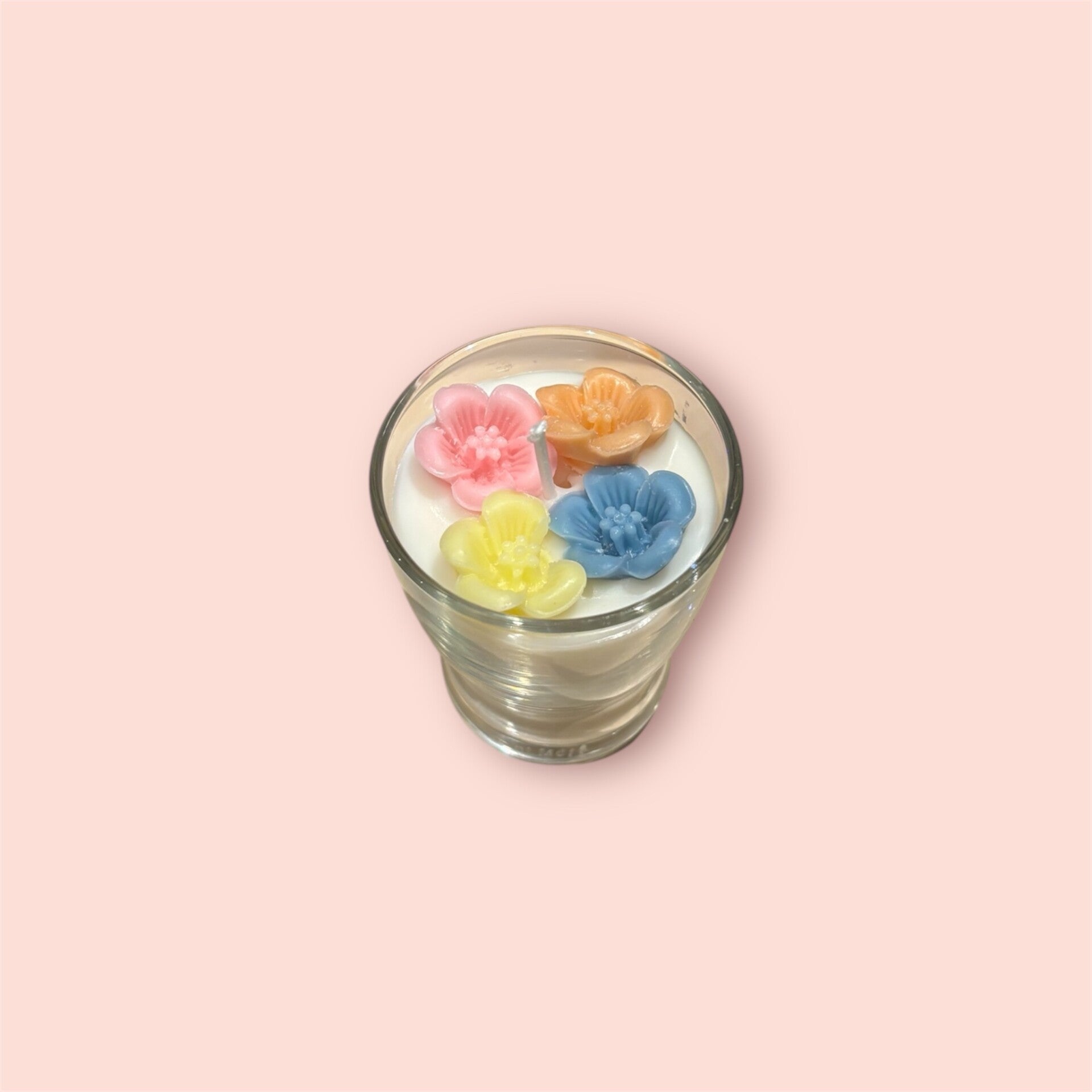 Een rugzakje gevuld met een mooi kaarsje met wax bloemen.