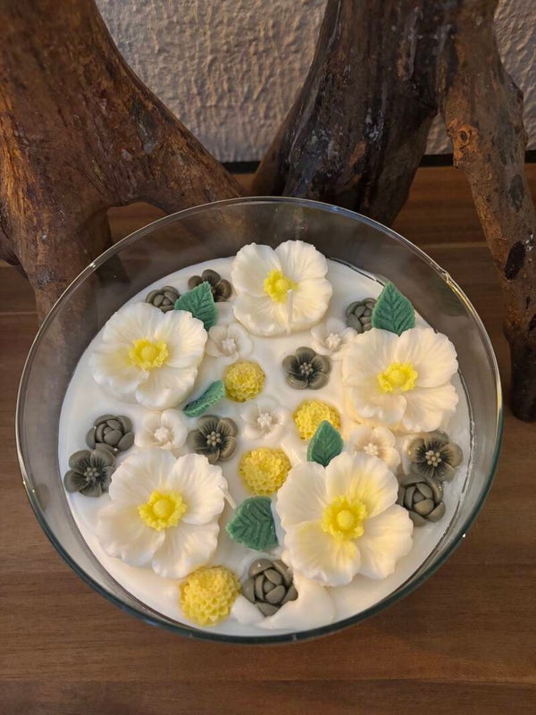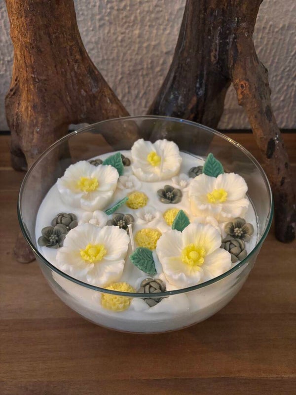Prachtige glazen schaal op voet. Gevuld met wax bloemen in de tinten Wit groen.