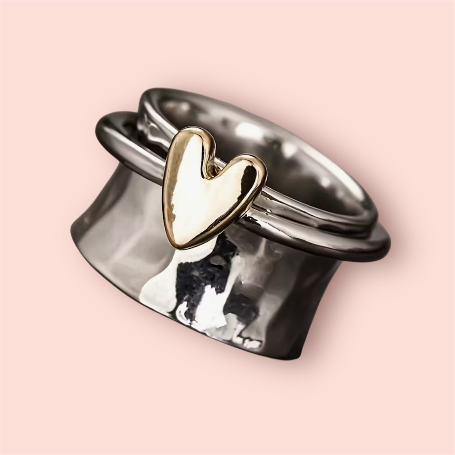 Zilver kleurige ring met een losse band erop met een hart.