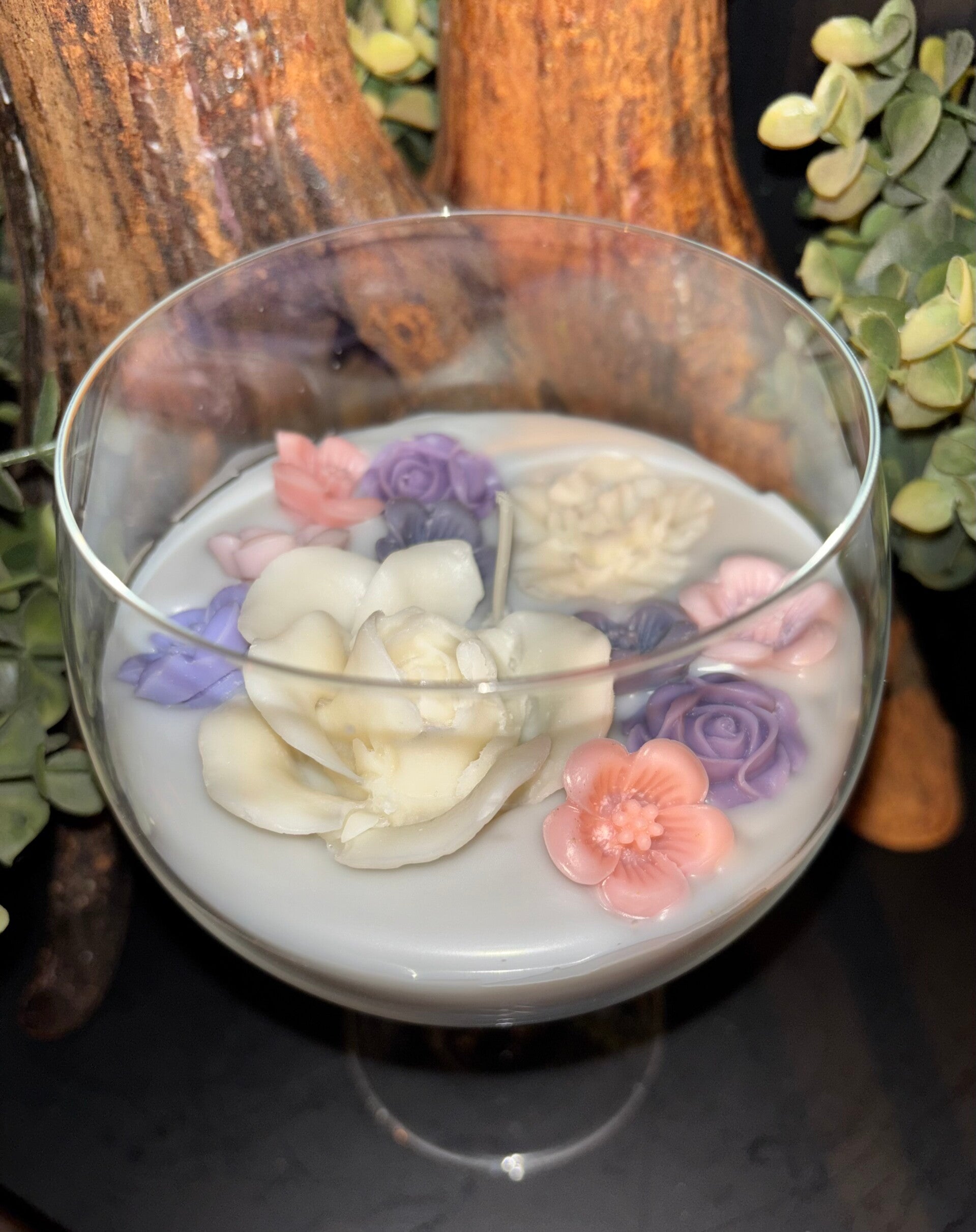 Prachtige hoge kaars in een Disign wijn glas. Bol glaswerk gevuld met blauw paars getinte wax bloemen.