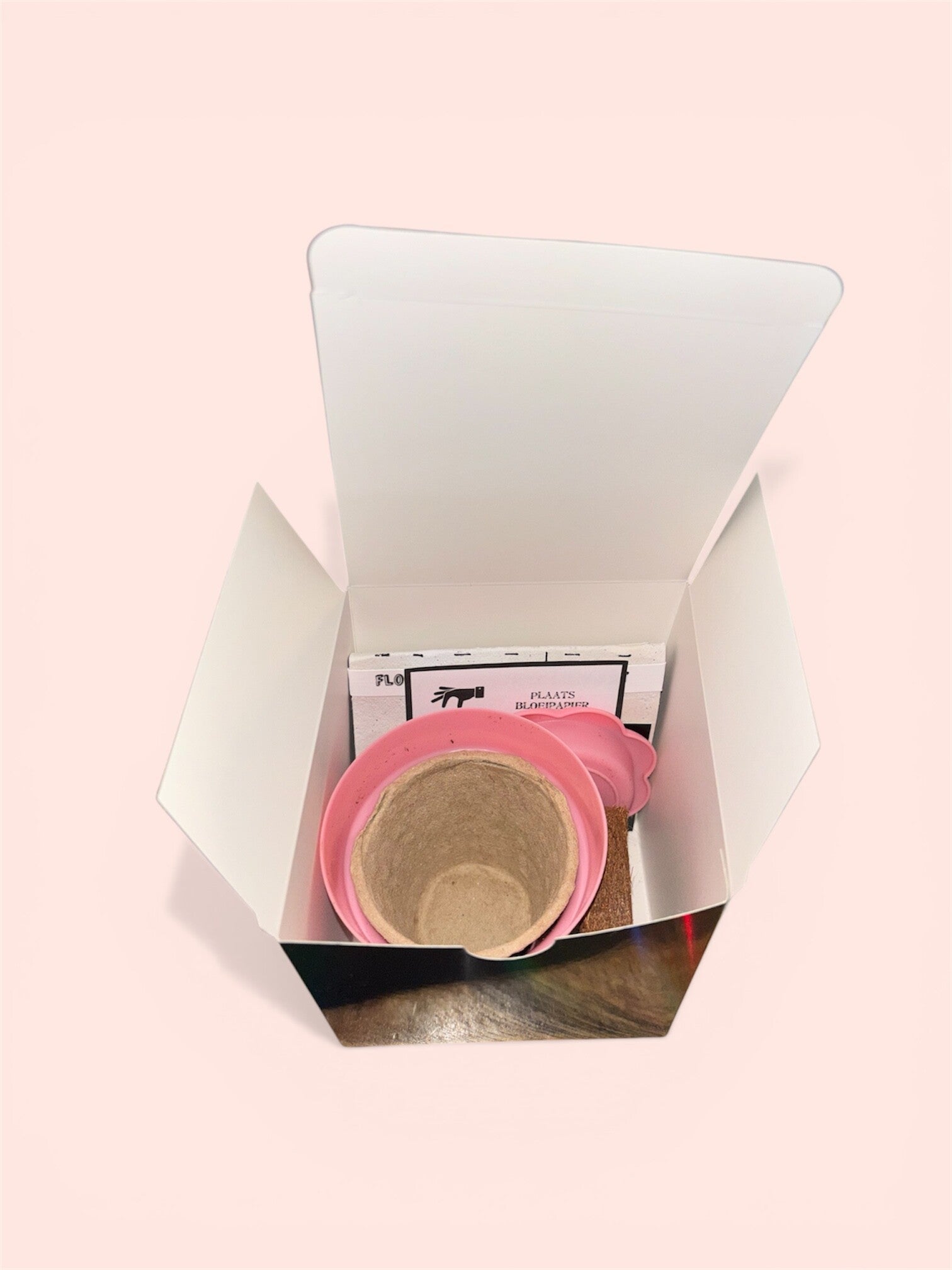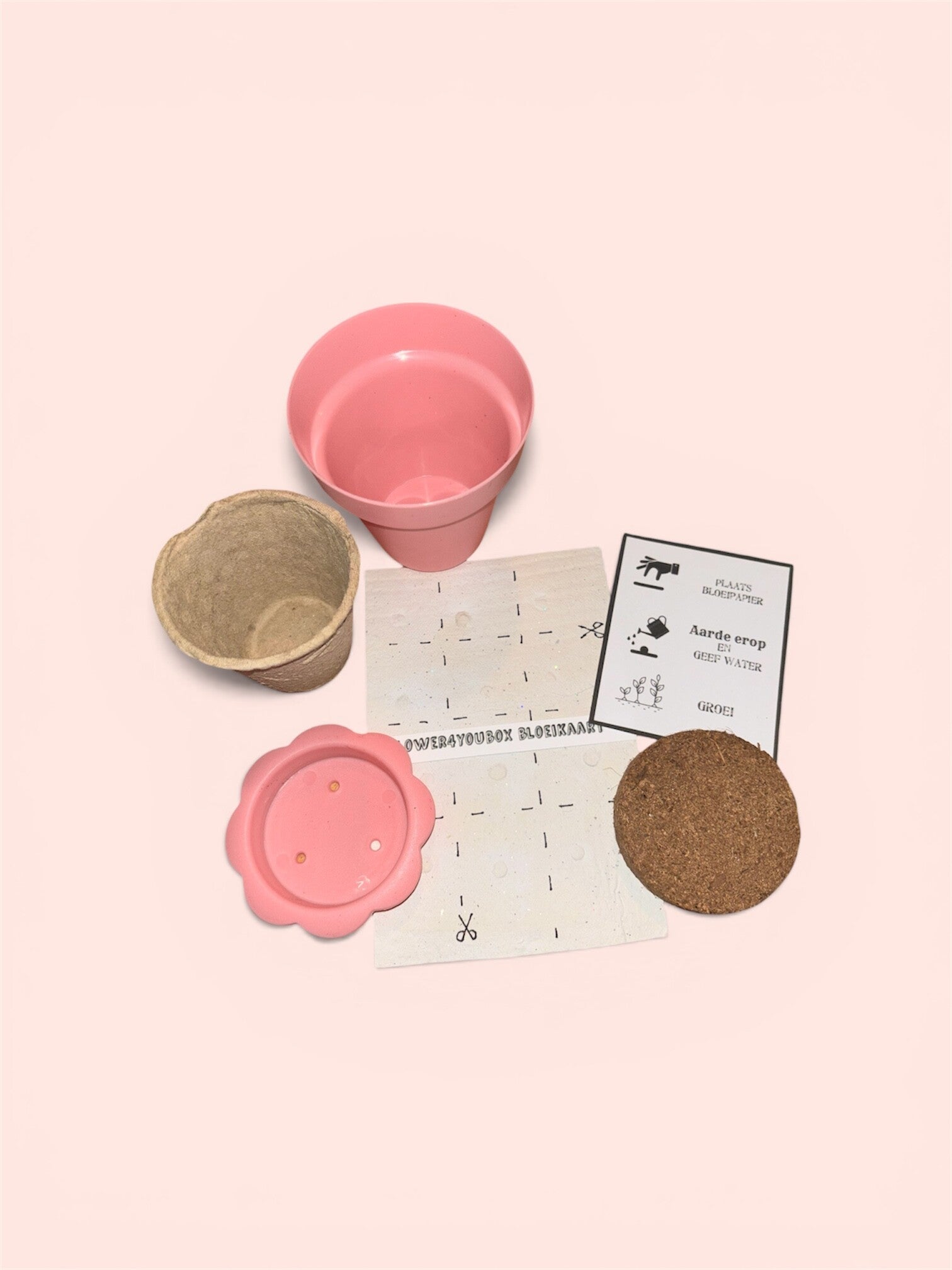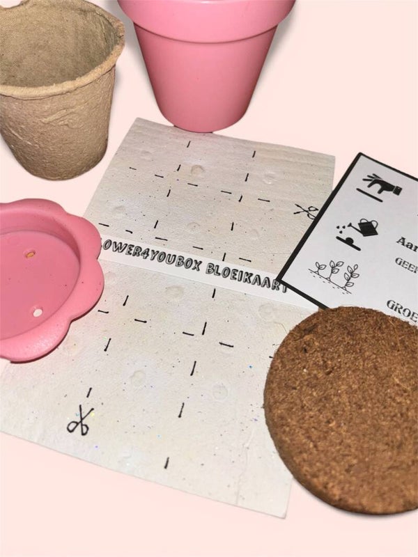 Inhoud: roze bloempot met schoteltje. Beschrijving, zwel aarde, overzet bakje naar grond,en stokroos bloeipapier.